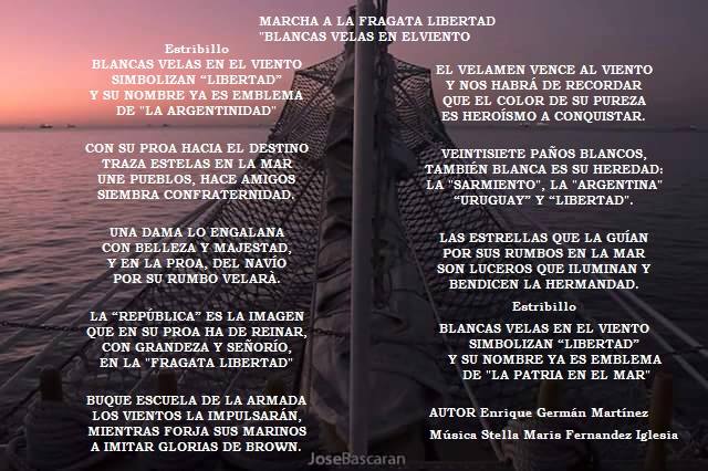 Por fin, después de más de medio siglo, la Fragata zarpará con sus propios acordes, su propia marcha. Ya no será mas como te dije una vez: el único barco que zarpa con una marcha del Ejército (originalmente dedicada al Gral. Ricchieri, que por modestia la declino y dedico al combate de San Lorenzo) en lo que único que tenía en común en que los españoles venian en barco y bajaron a recargar la aguada.